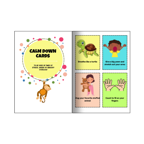 The "Calm Down Cards" are your tool for the most difficult moments. When you feel your child is about to have a meltdown or is feeling overwhelmed, encourage them to choose a card. Each card offers a simple, illustrated strategy to help them find their calm again. Keep them in a "calm zone" or a dedicated corner of the house, so they are always accessible when needed.